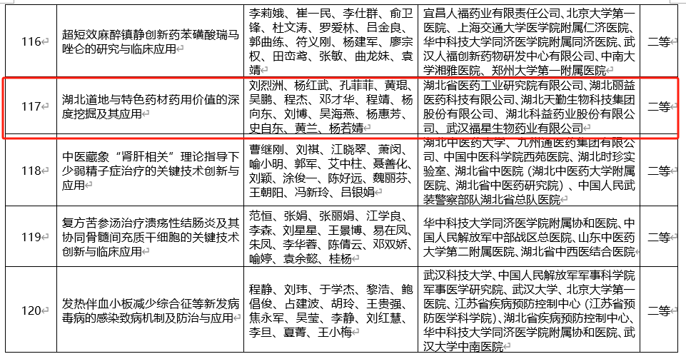近日,2025年度湖北省科學技術進步獎名單公示,由天勤生物聯合湖北省醫藥工業研究院有限公司、湖北麗益醫藥科技有限公司、湖北科益藥業股份有限公司、武漢福星生物藥業有限公司共同完成的“湖北道地與特色藥材藥用價值的深度挖掘及其應用”項目,榮獲二等獎。這一成果標志著湖北省在道地藥材資源開發利用與中醫藥現代化研究方面取得重要進展。